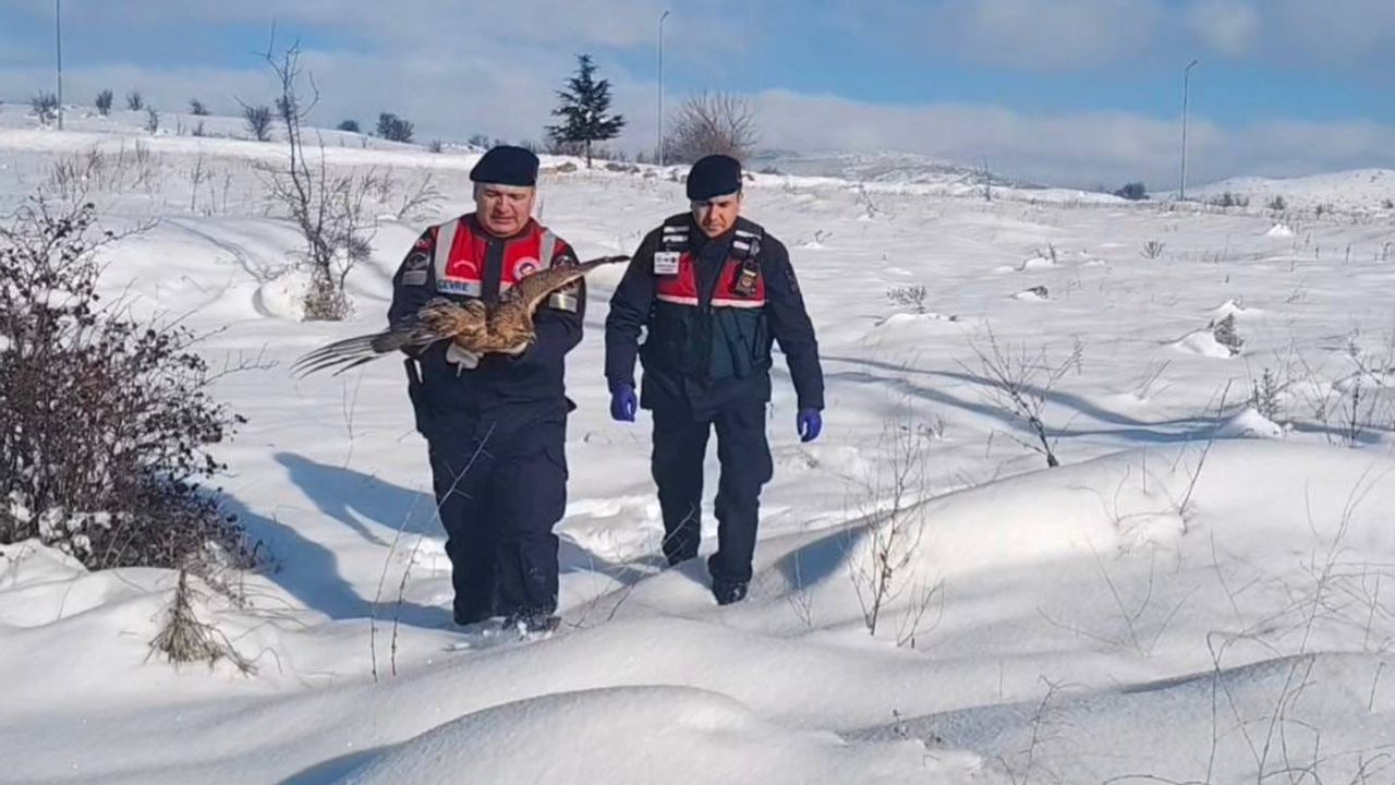 İl Jandarma Komutanlığı Çevre, Doğa ve Hayvanları Koruma Timi ile Sorgun İlçe Jandarma Komutanlığı ekipleri, kırsal alanda yaralı ve bitkin halde kızıl şahin buldu.